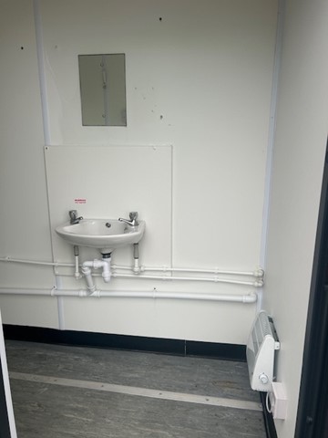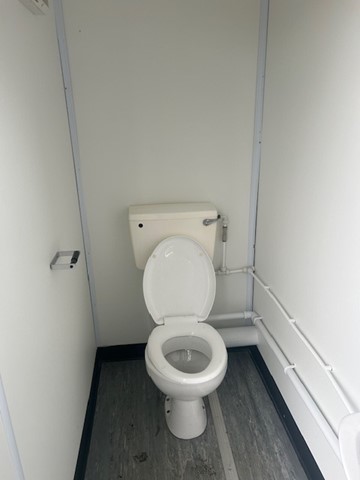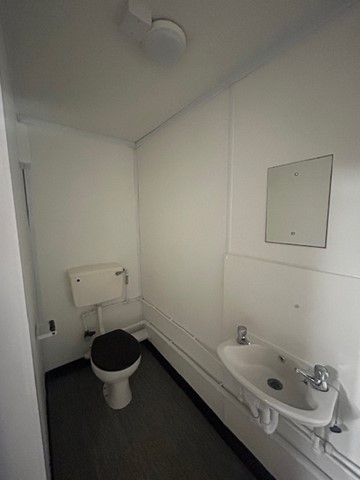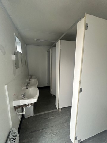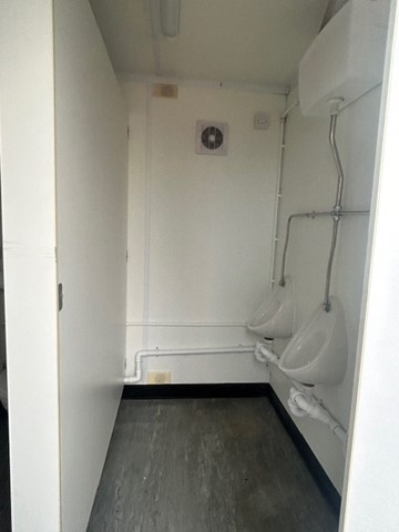This Used/Refurbished container toilet cabin measures 16ft x 9ft (plus 10” jack legs) and is configured as a 3+1 toilet block, ideal for sites, events, or temporary facilities.